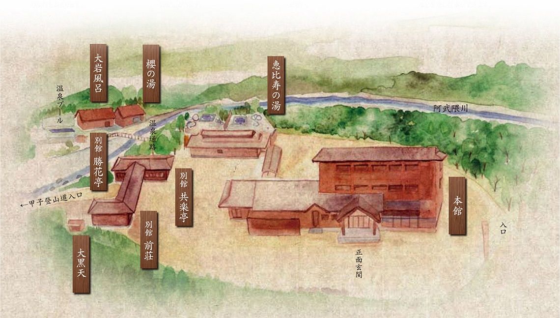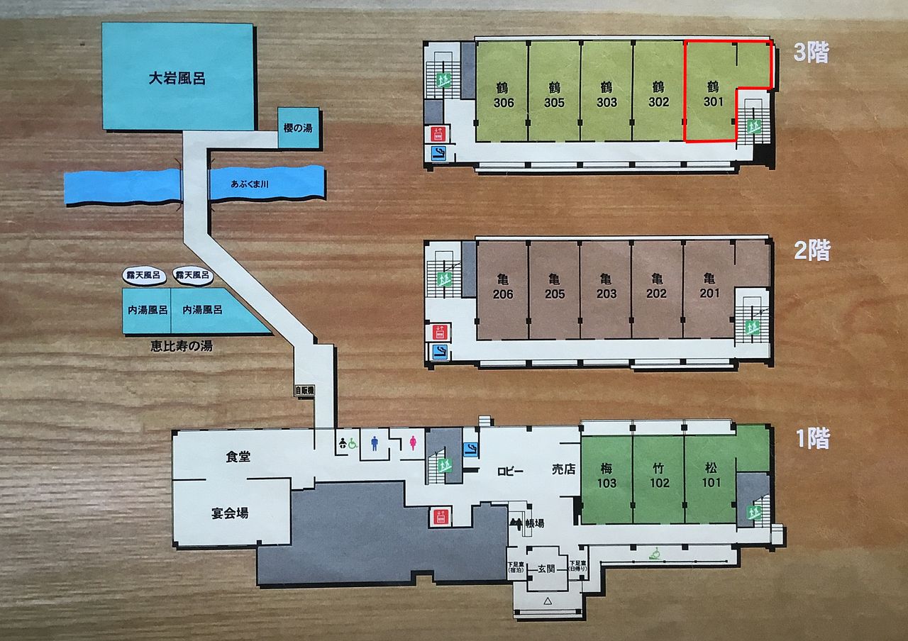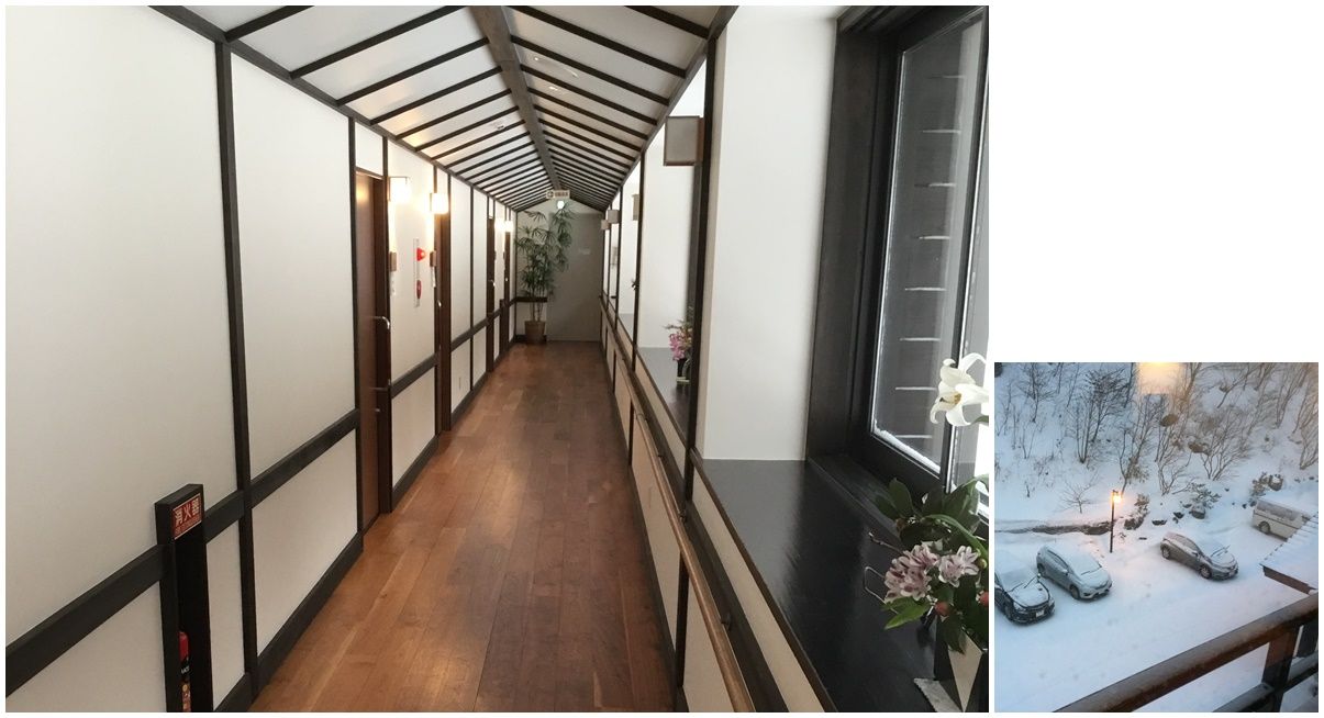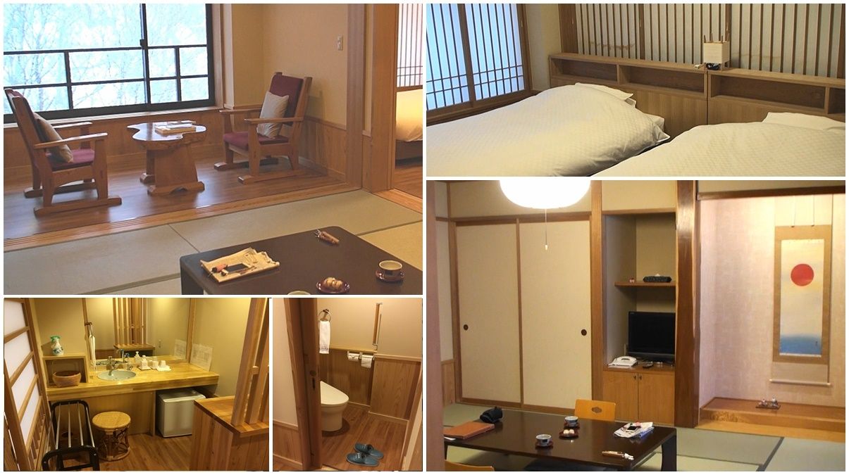 雨降りのため予定よりも早く15時半肘折温泉 丸屋に到着。招待を受ける部屋はベッドとソファーが置かれた下図の間取りの伍号室。