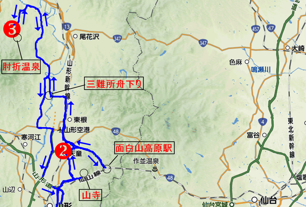 次の目的地である最上川「三難所舟下り」乗り場に向かう途中の国道13号線で綺麗な虹が出現。今日は雨かと思うと急に晴れ間が出たりとおかしな天気です。