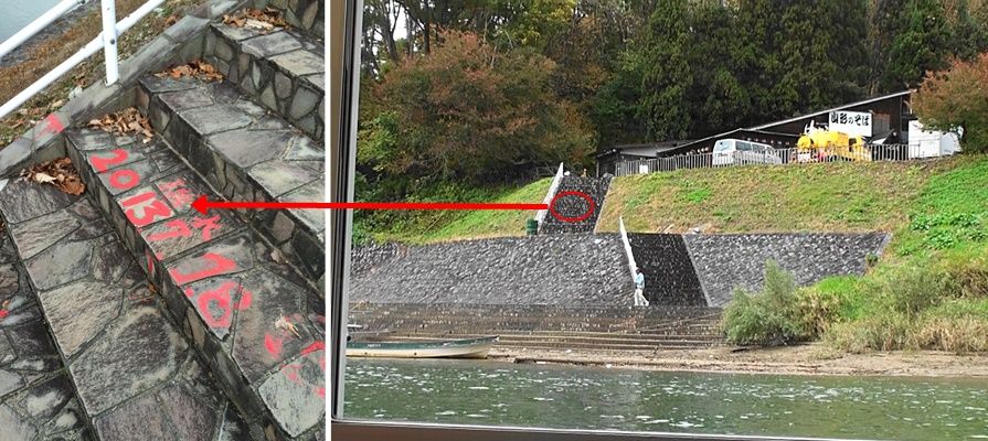 階段を上がる途中に赤ペンキで2013 7 18と記されいるのを発見。これは2013年7月18日の低気圧に伴う集中豪雨による水位上昇の記録とのことでした。下船後マイクロバスで元の船乗り場まで帰る途中、見やすい場所として立ち寄ってもらった、急流の難所「隼」と三ヶ瀬橋の上から「三ヶ瀬」の眺め(バスの中から)です。