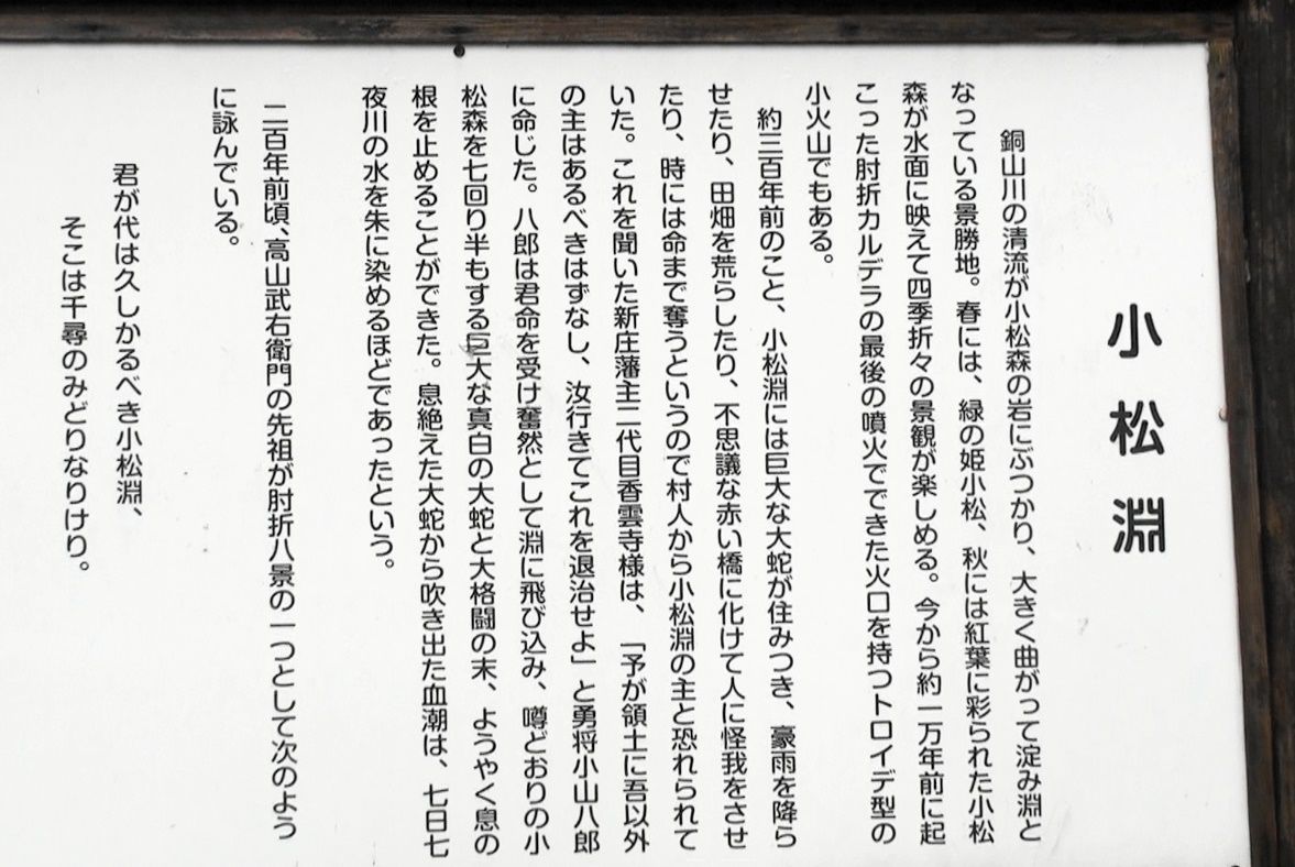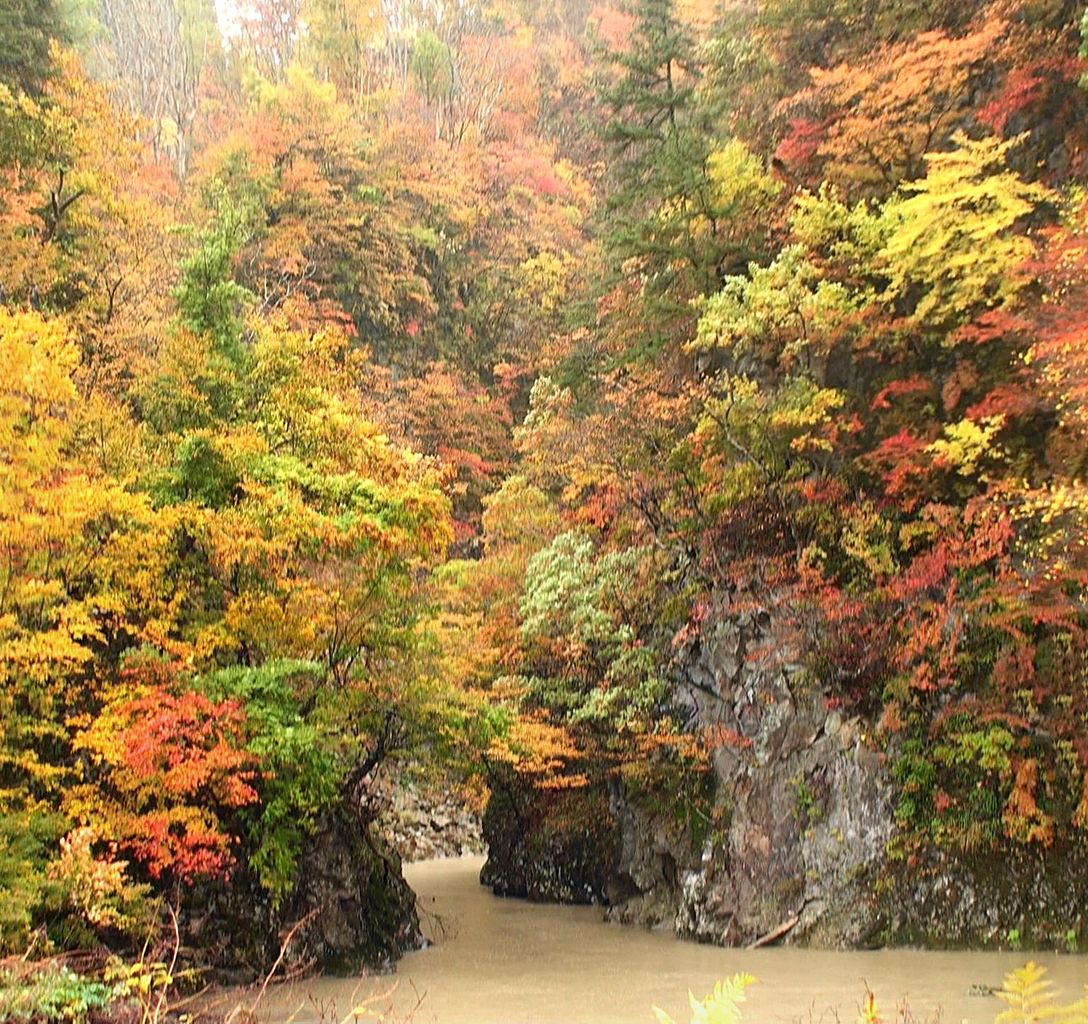 三ヶ瀬橋の上から「三ヶ瀬」船乗り場に戻り、今日のお宿 肘折温泉 丸屋に向け出発。肘折温泉近くになると又雨が降り出し、期待していた当日の周辺紅葉見学を諦め肘折温泉入口の小松淵に、そのむかし、新庄藩の侍、小山八郎が大蛇を退治したと言う大蛇伝説が伝わる銅山川の名勝で、新緑や紅葉が水面に映えて四季折々の彩りが美しい渓谷と言われていますが、当日は下の写真の通り川は雨による泥水。