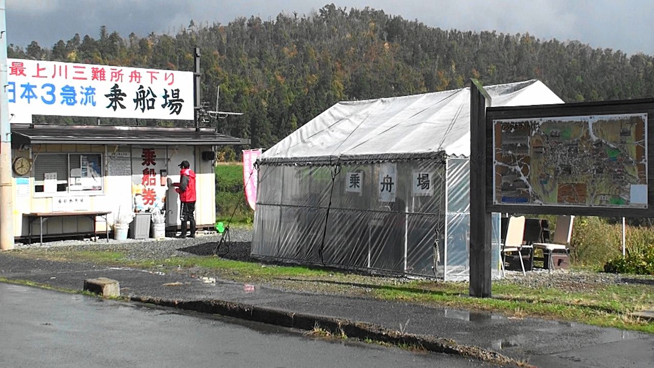 11時30分三難所舟下り乗船場に到着。2015年11月に訪問した「古口港の最上川舟下り乗船場」と比べるとかなりショボイ所で、舟下りマップもペンキがはげ落ち良く見えなかったため「そば街道案内マップ」の一部を下に添付しました。