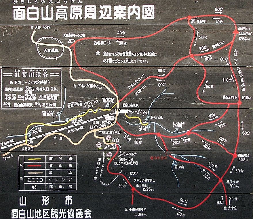 ただ途中から雨が降り出し紅葉川渓谷の散策は残念ながら断念。駅の前に面白山高原周辺案内図(下)があり、駅傍の民宿の存在からこの駅を基点とした散策路や登山道の様子が克明に描かれています。時期によっては登山客で賑わうところなのでしょう。