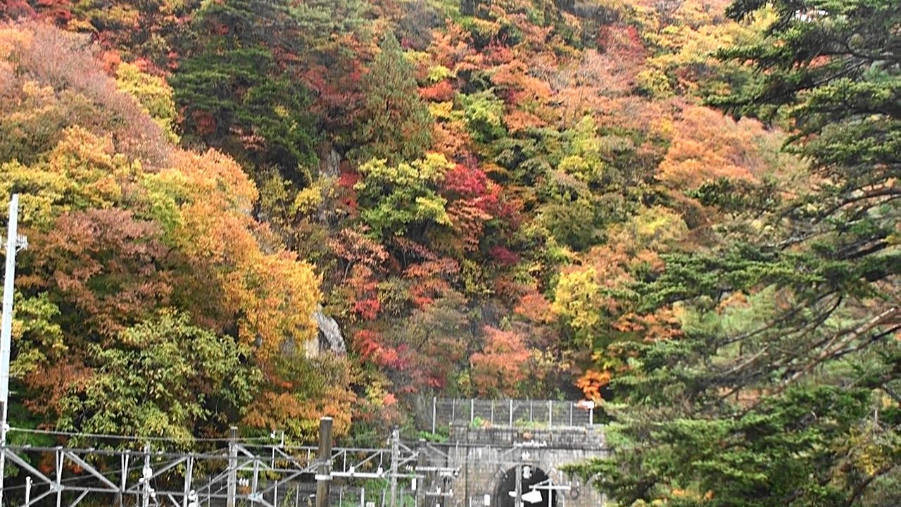 無人駅構内に入ると駅名の由来(面白権現から)や時刻表の掲示があり、西隣の山寺駅からわずか7分の距離ですが通学、通勤時間を除けば2時間に1本とその不便さにビックリです。雨のため今回は駅周辺の紅葉状況の観察のみとなりましたが、またの機会に渓谷の散策に挑戦したい所です。