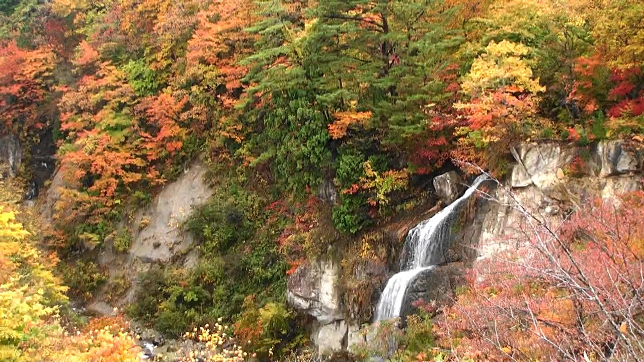 予定していた紅葉の渓谷散策のため②地点から面白山高原駅へ車を進め、約45分で面白山高原駅に。