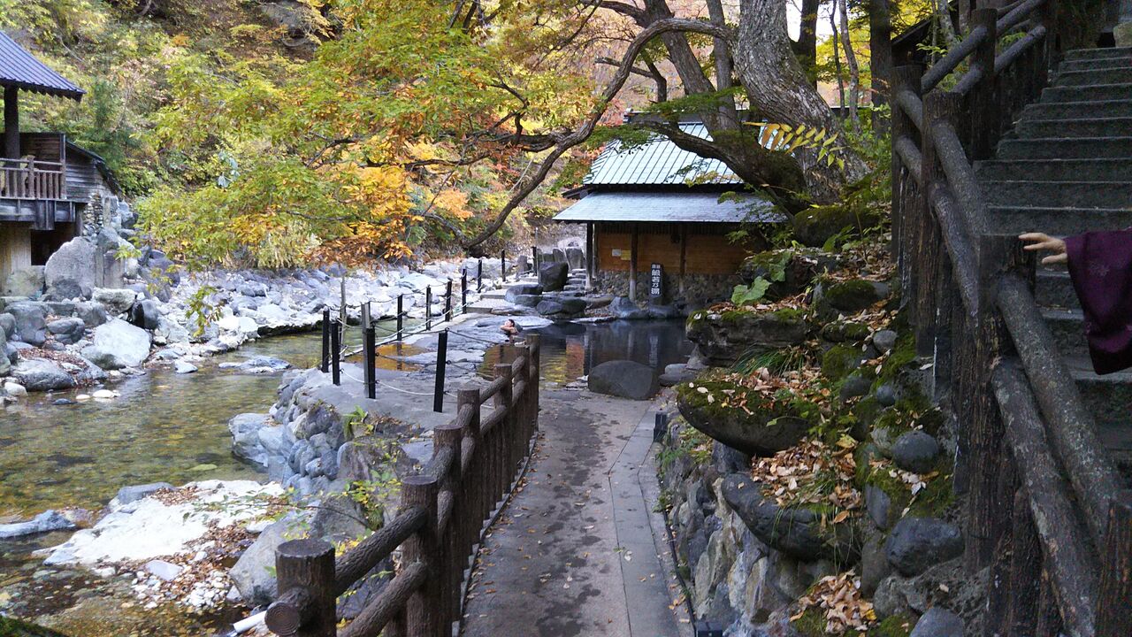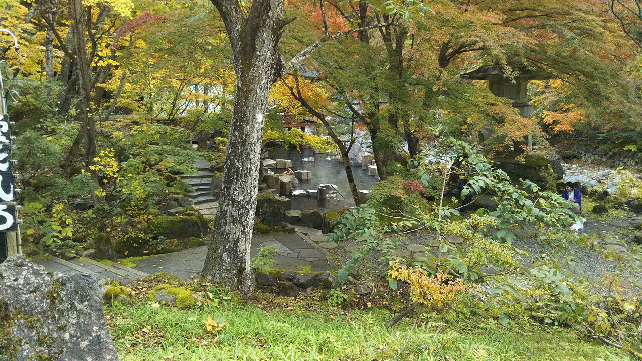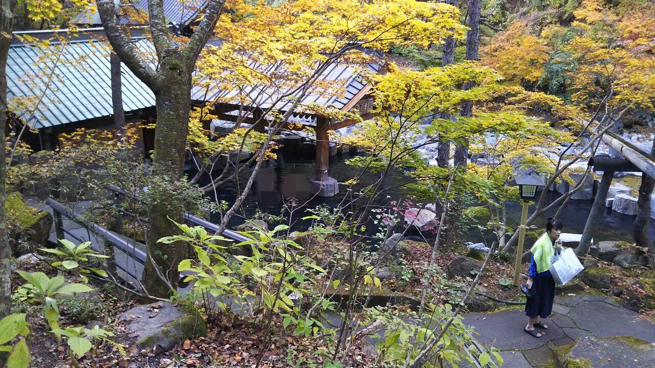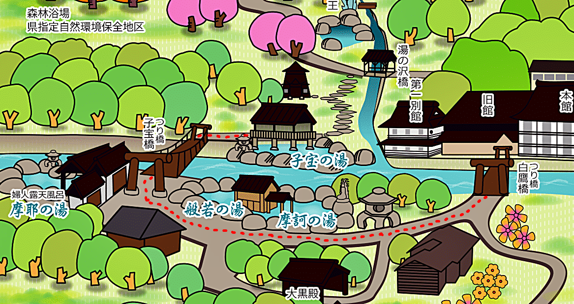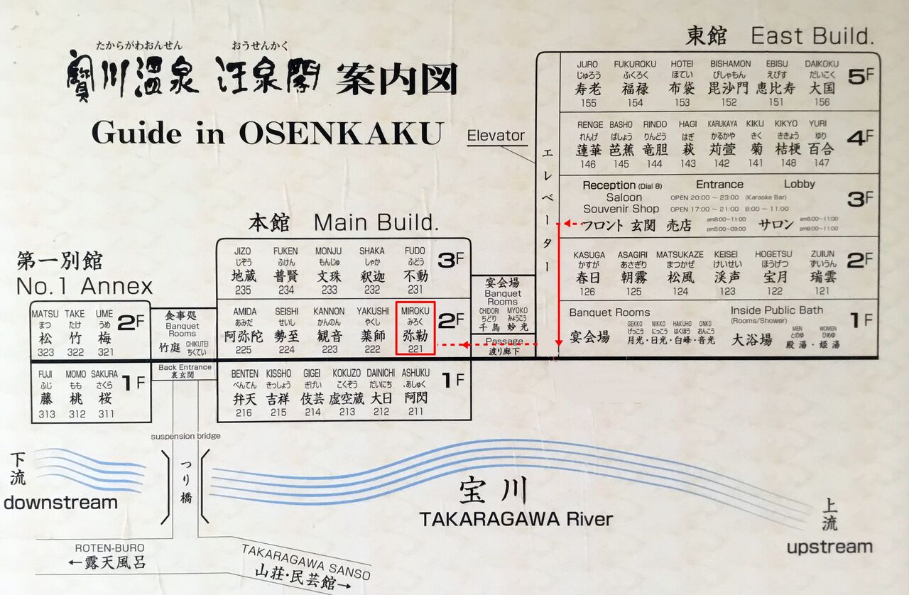 門を入り、左手に行くと日帰り入浴専用の「宝川山荘」、宿泊客は下図のように右手