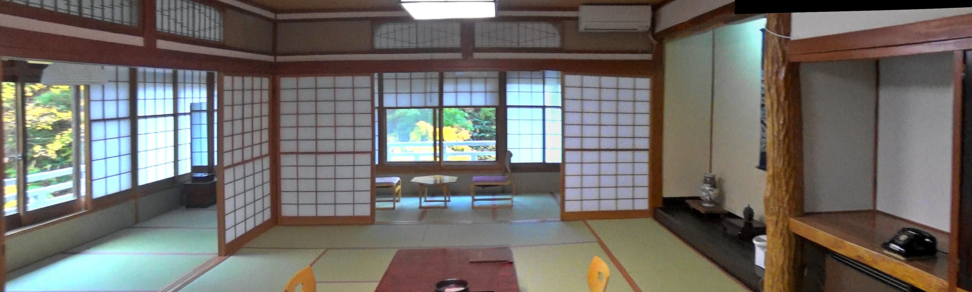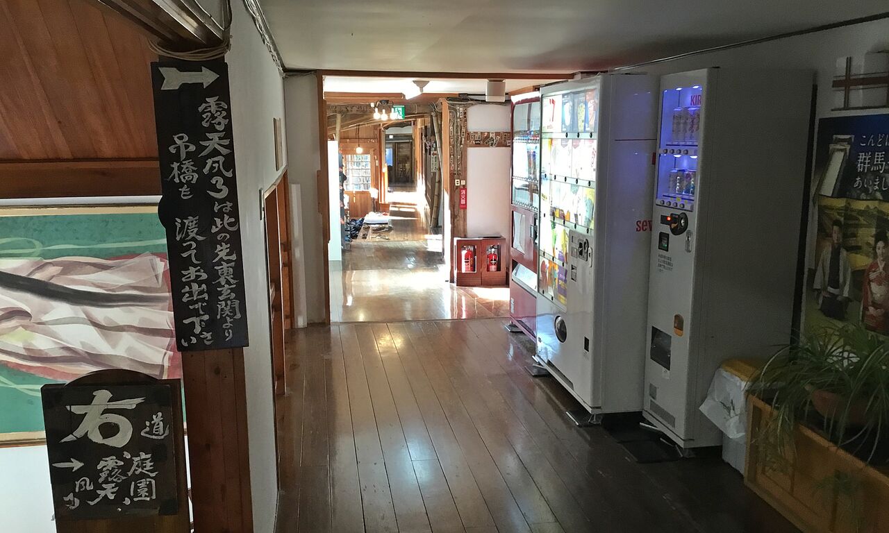 テレビは入口付近に置かれ、左手廊下の奥にはウオッシュレット付きのトイレ、窓からは川の上流にある東館が見えます。尚、廊下に置かれた座布団は7枚を確認、部屋の2枚と合わせるとなんと9名の宿泊が可能な部屋のようで、2人のみの滞在には不必要な広さでした。予約時にタイプの違いがある本館角部屋(4室のみ)の指定が出来なかったのが残念です。温泉へは本館から旧館の出入り口に、スリッパからサンダルに履き替え外へ、