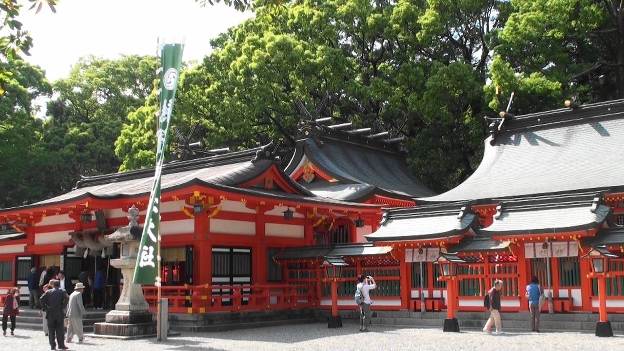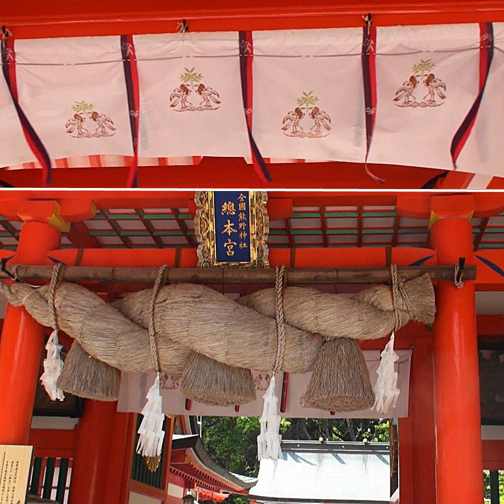 さらに進むと樹齢千年の梛の大樹に、その葉っぱの葉脈が独特で、主脈がなく縦方向にのみ平行に伸びており、縦方向に引っ張っても簡単には切れないことから、縁結びの願掛け・お守りにされているようです。そして参道の正面に巨大なしめ縄がかかる神門、その後ろの幕には梛の木の葉と、3本の足を持つ八咫烏が描かれています。