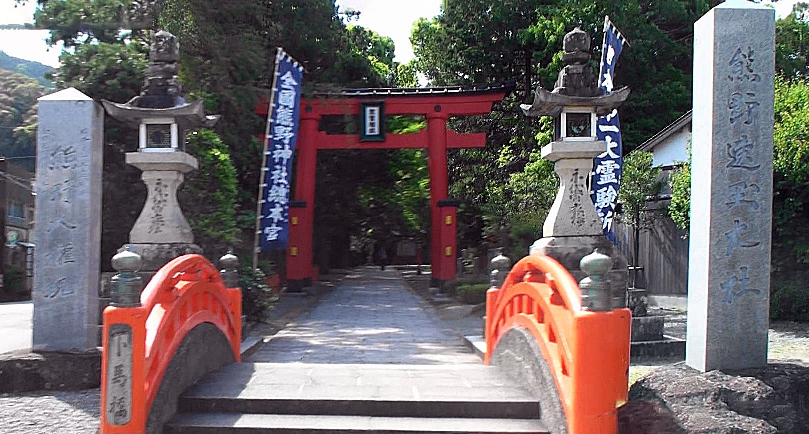 そして、この八咫烏が日本サッカー協会のシンボルマークとなった背景に、サッカーを始めて日本に紹介し、その普及に貢献した中村覚之助氏の出身が那智勝浦町であることに関係しているようです。神門から中へ入ると、左手の拝殿とその奥に御祭神のイザナギ・イザナミを主神に十二柱の神々が祀らている社殿が連なっています。