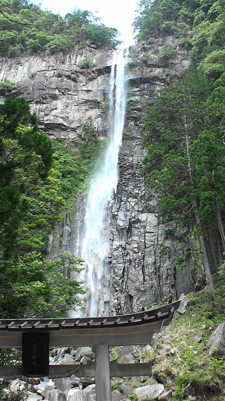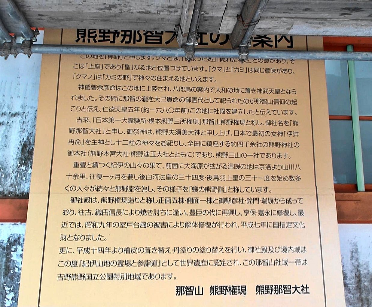 お参りのため養生シートの中に入ると熊野那智大社の御案内板があり、八咫烏(ヤタガラス)、神武天皇、熊野権現、イザナミノミコトを主神とし十二柱の神々をお祀りなど、熊野三山特有の表示が見られます。続いて那智大社の別宮、飛瀧神社へ移動。傍で見る落差133mの滝はさすがに素晴らしく自然信仰の起こりがうなずけます。