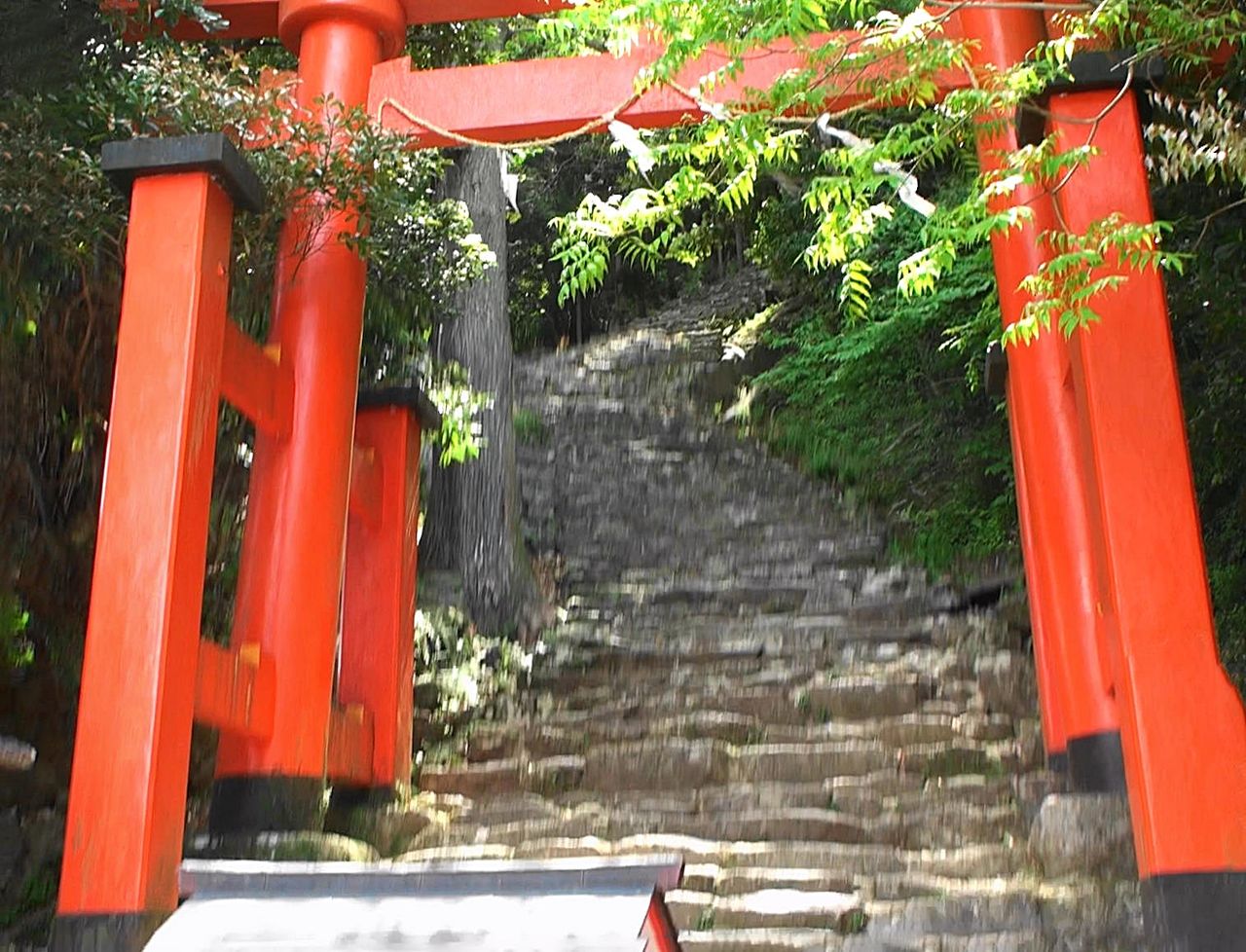 何とか15分で頂上の鳥居前に到着。この鳥居を入ると巨大な一枚岩、その上に熊野権現が降臨されたと言われるしめ縄で巻かれた巨石 ゴトビキ(方言でヒキガエルのこと)岩と小さな社殿があり、社殿にお参り後振り返ると新宮市の街と海が眺められます。