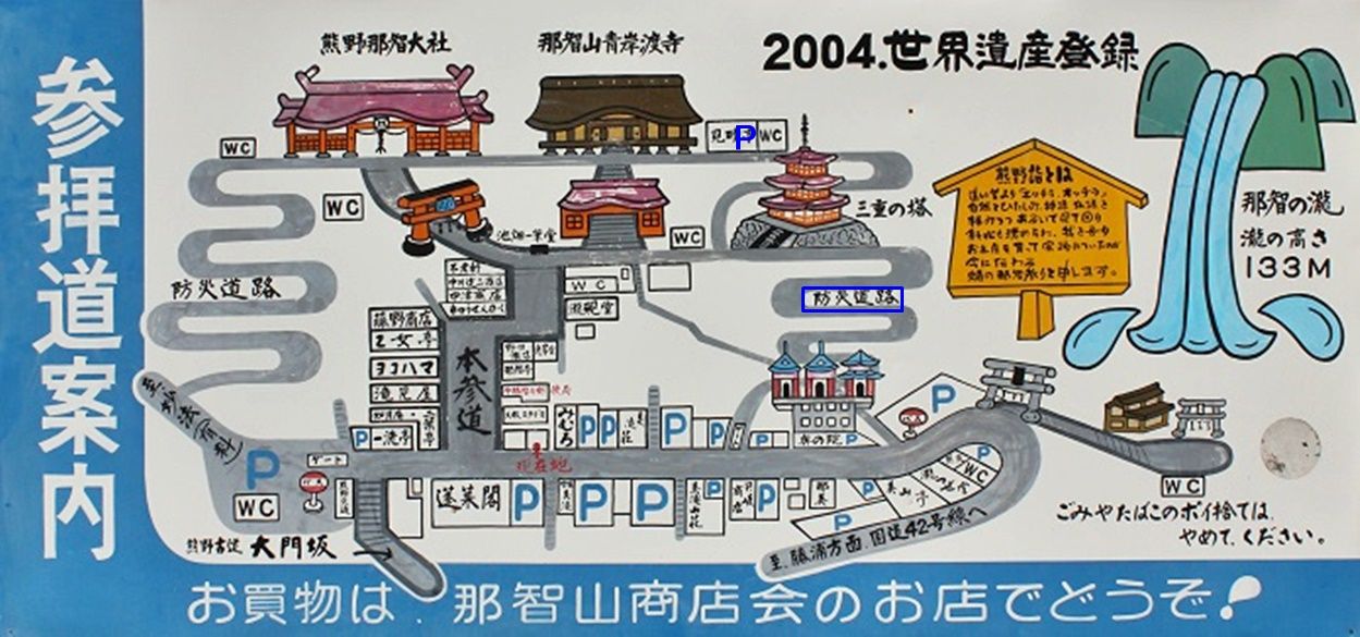 境内から那智の滝が眺められます。那智大社には470段の階段を上らず、車で通行料800円を支払い下図の防火道路(□印)を経由して青岸渡寺駐車場(P)へ、車を留め那智大社へ歩いて行くと、同じ境内の中にあるかと思うほどお寺と神社が隣接している不思議なところです。