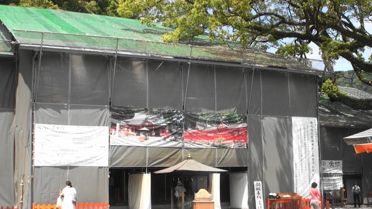 ところが那智大社の拝殿は、残念ながら建築工事用養生シートで覆われ来年3月まで改修工事中。