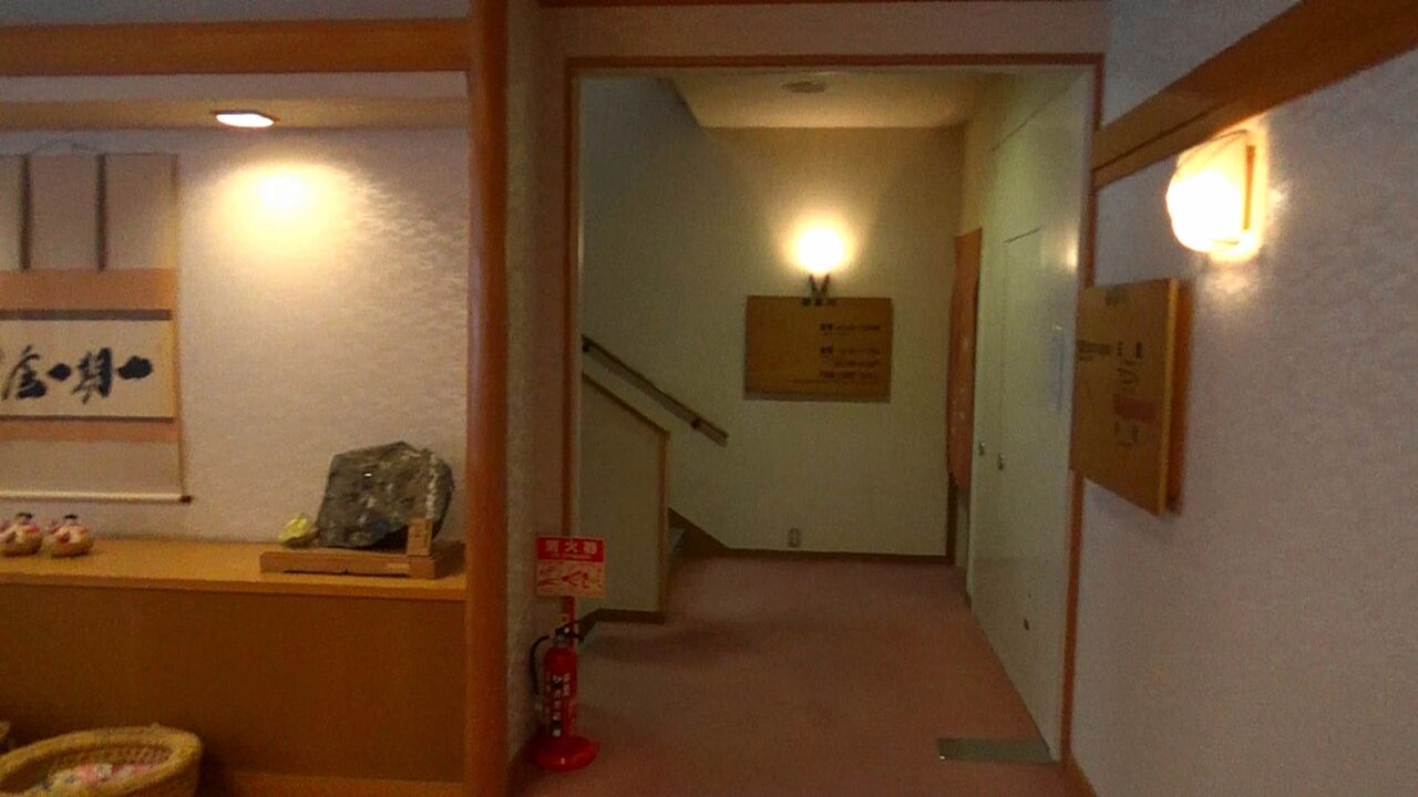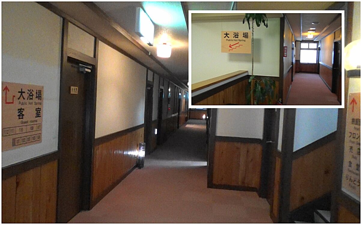 階段付きの渡り廊下を降りて大浴場2階に、さらに階段を下りて大浴場1階の更衣室に辿り着きます。(ロビーからは地下4階に相当するかなりの距離)。