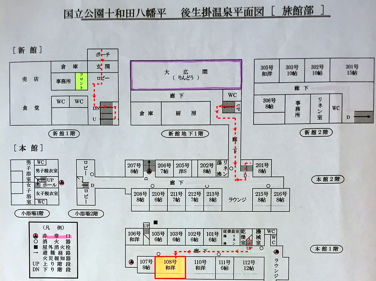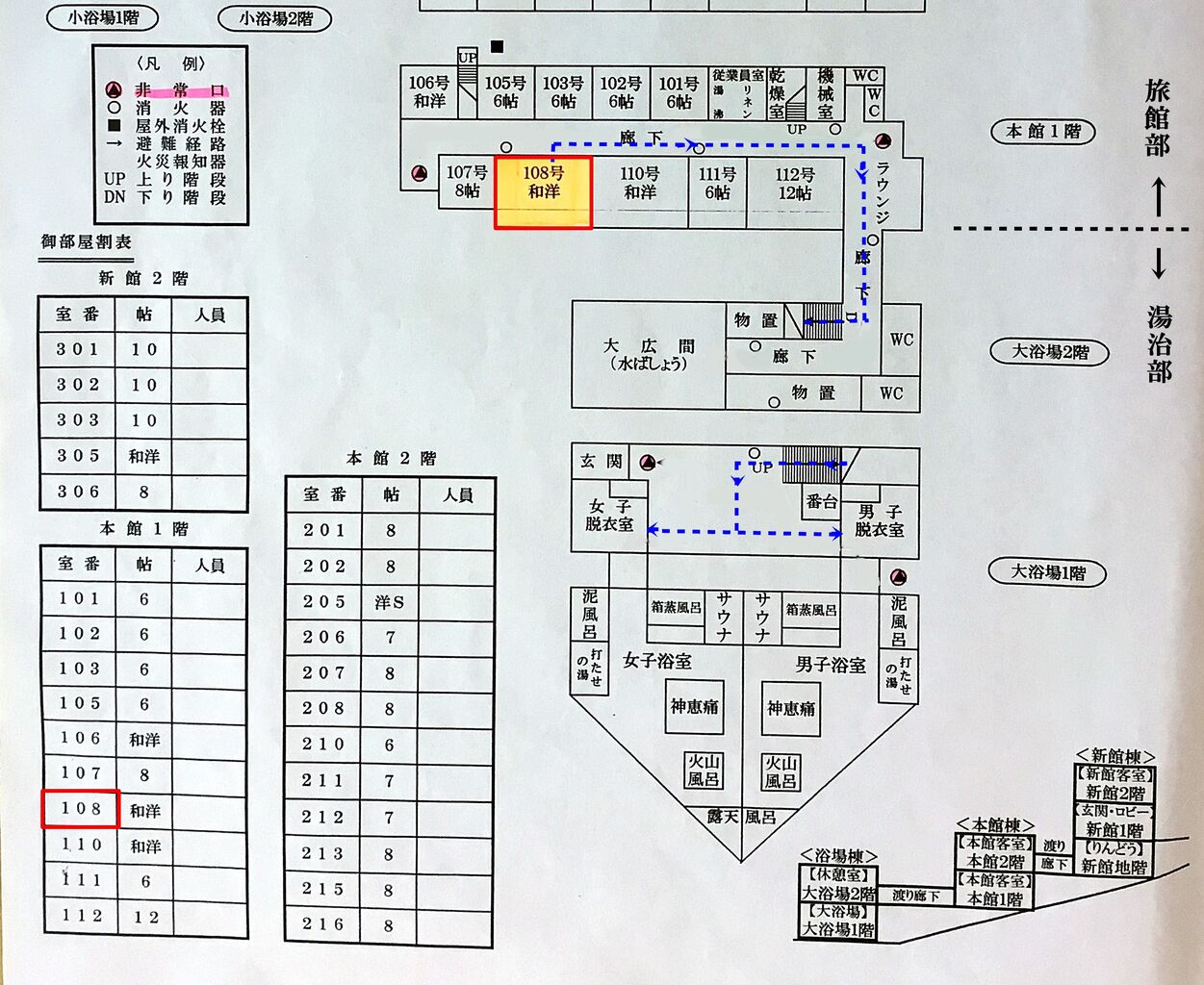風呂場へは108号室を出て右へ青い破線に沿って、「大浴場」の矢印の方向へ、扉を開け旅館部から湯治部に入り、