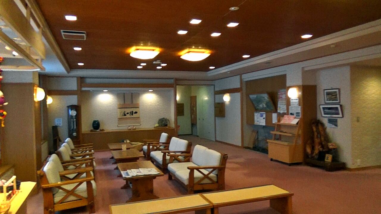 旅館入口入口の扉を開けて中に入ると、外観からは想像できないくらいモダンなフロントとロビーが配置されています。