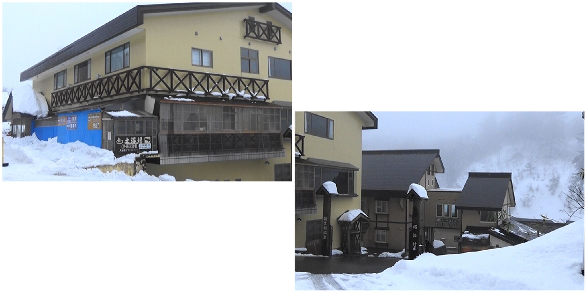 今回初めて雪道を走行して、御所掛温泉旅館前に到着。尚、大浴場の矢印方向(外来入浴客)に進むと、湯治村の立て札がある湯治部へ繋がっているようです。