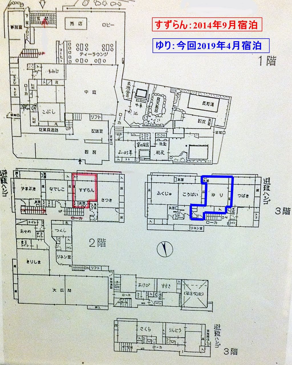 部屋にあった館内配置図(下図)で確認すると、前回2014年9月訪問時宿泊した二階の部屋「すずらん」の丁度真上になります。