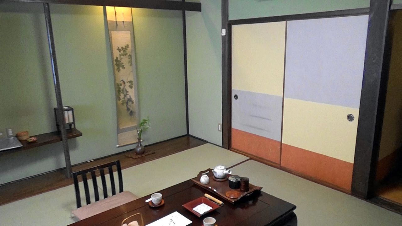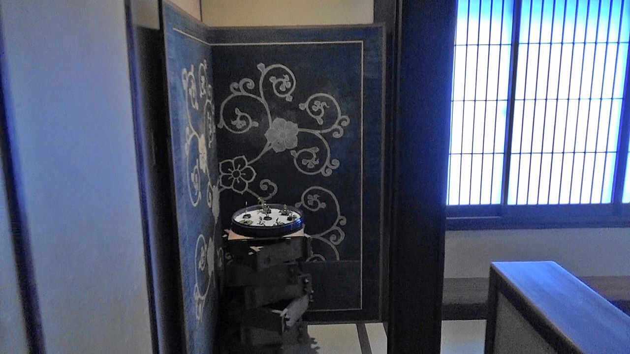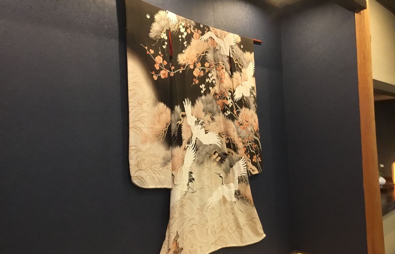 大広間へ入ると右手奥の床の間に、時代を感じる白鶴が描かれた立派な打掛が飾られおり、