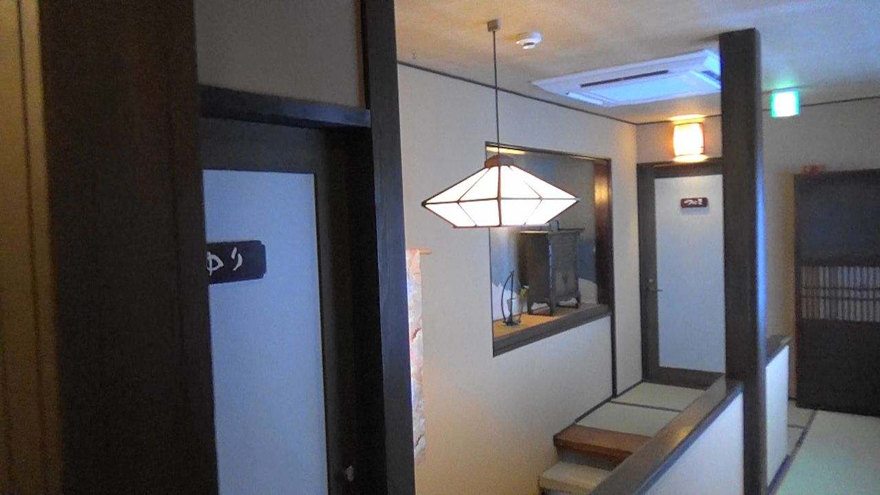 畳の廊下を真っ直ぐ進んで一階への階段を降り、フロント前からロビーラウンジを越えてガラス張りの廊下を進んでいきますが、温泉の状況は前回訪問時と変わりがないため、2014年9月訪問のブログを御参照ください。今回は食事編として、左に見える板の廊下の方へ曲がり大広間(食事処)へ向かいます。