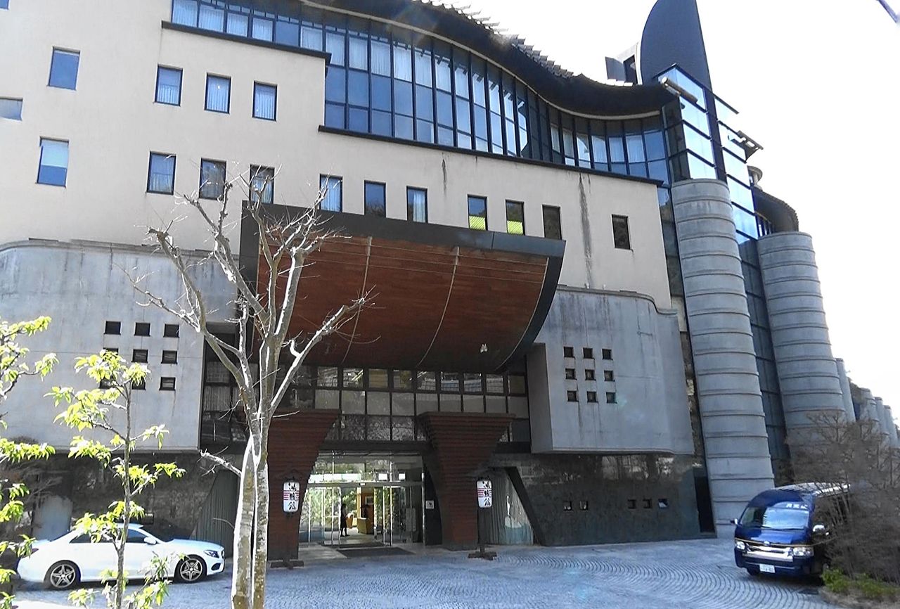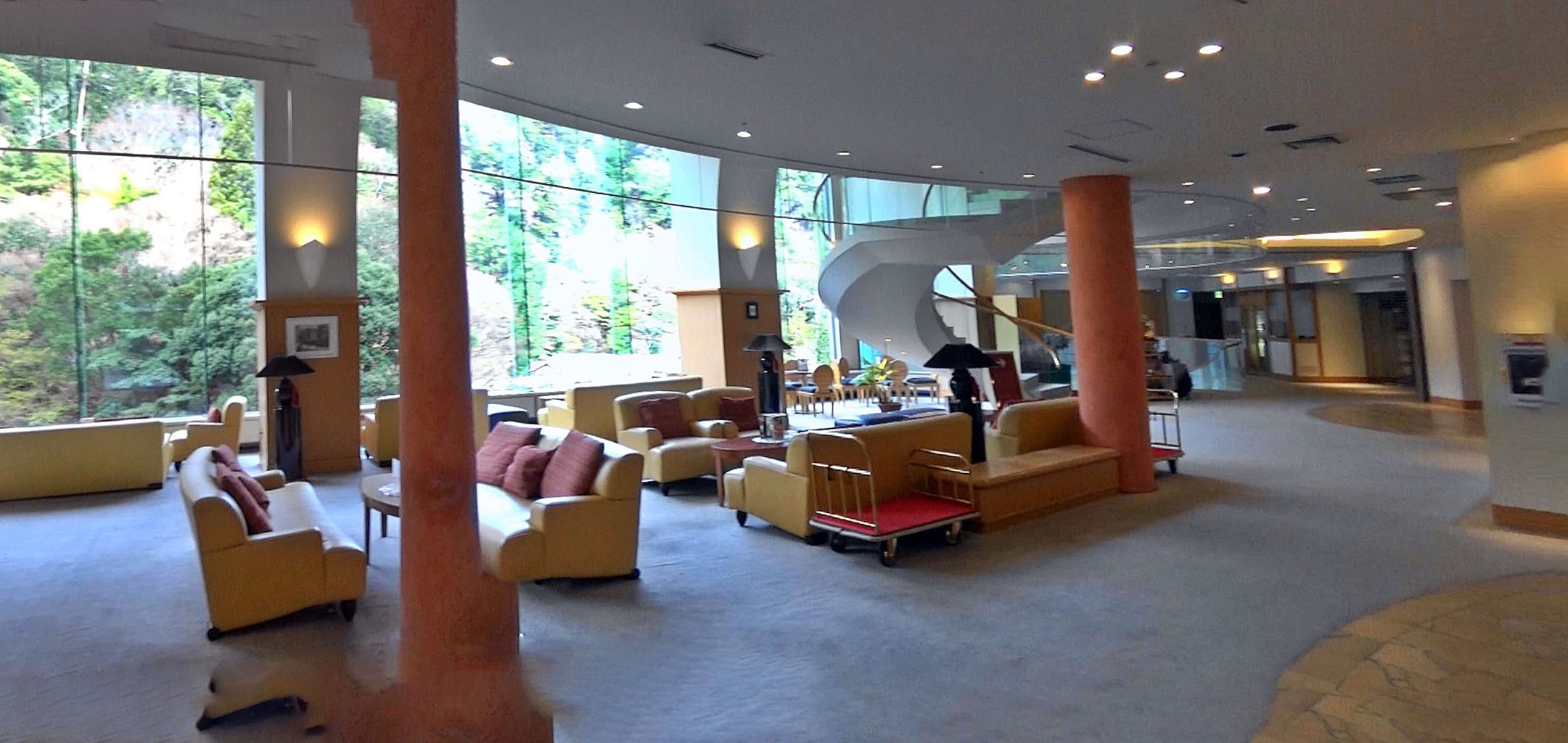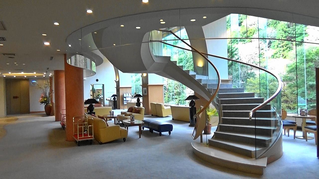 月光園 鴻朧館玄関前外観はヨーロッパのお城の雰囲気です。中に入るとフロント前に開放的なロビーが広がっており、このロビーのソファーに座ってウエルカムドリンクを飲みながらのチェックイン。