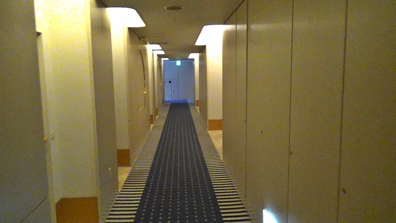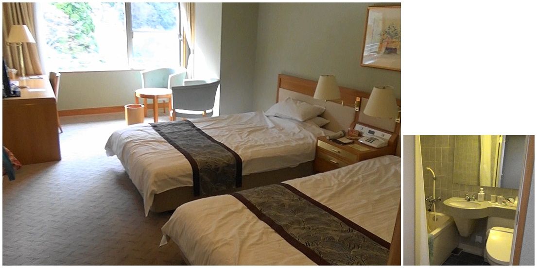 部屋は予約済のツインベッドの洋室へ、ロビーからエレベーターで5階に。この建物は川に面して8階建になっており、入口の玄関ロビーは3階に位置していると案内係から説明を受けました。