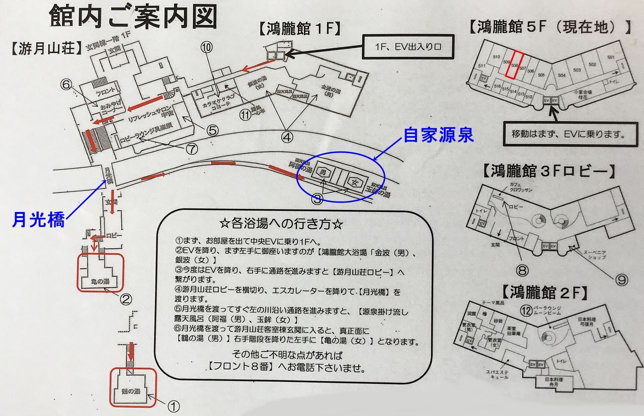 月光園というのは純和風数寄屋造りの游月山荘と和洋折衷の造りの鴻朧館の2館を合わせた屋号となっているようです。玄関入口は別々ですが游月山荘のロビー棟と鴻朧館1階が連絡通路で結ばれており、両館の施設を共通で利用可能となっています。