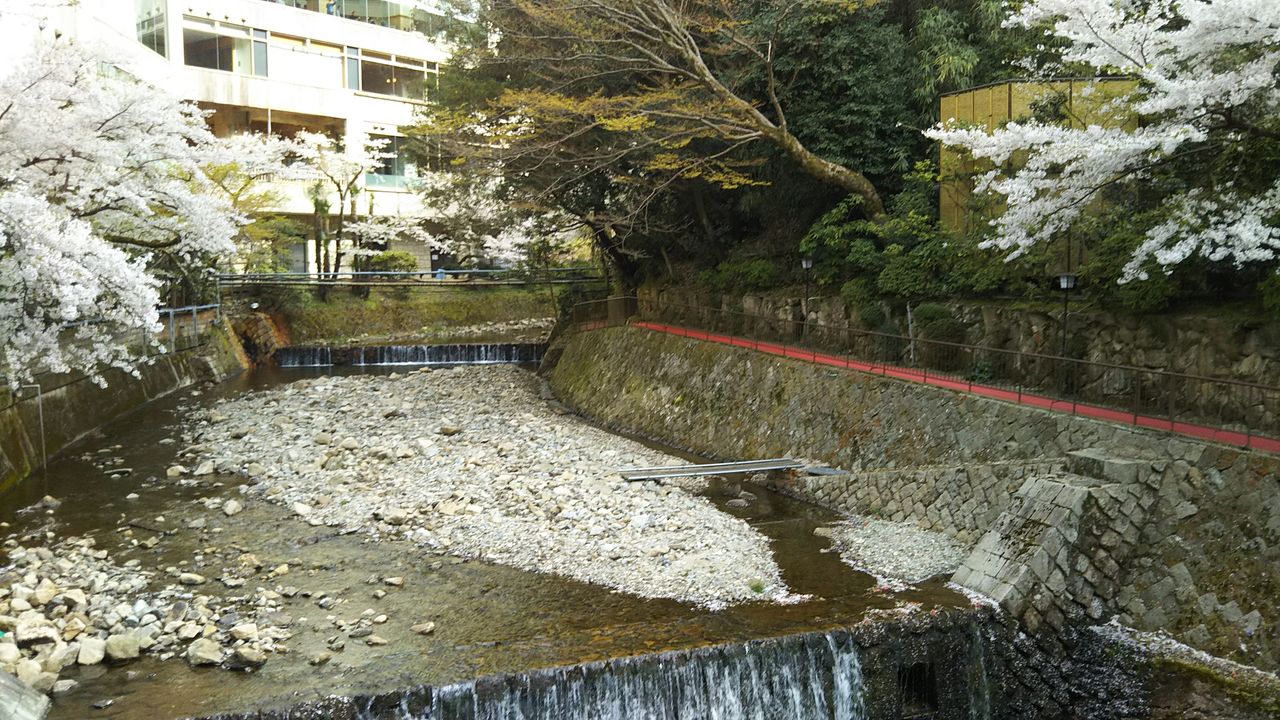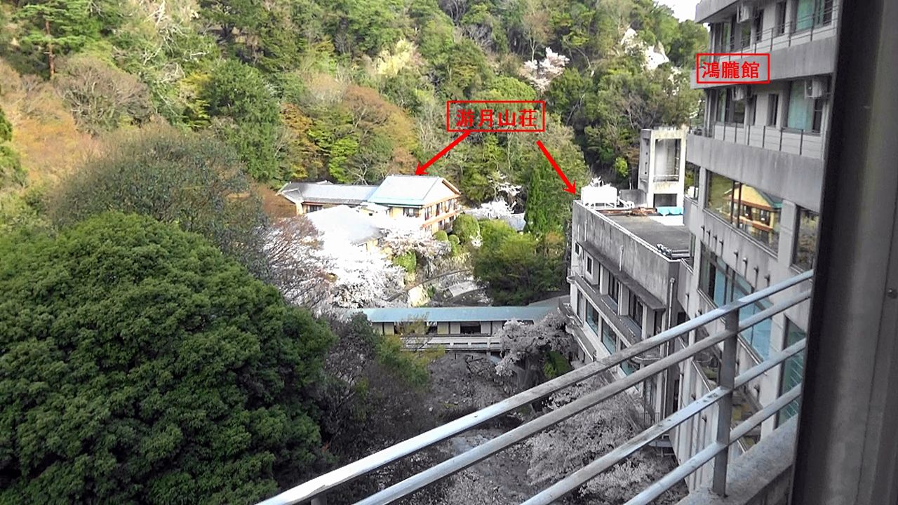 部屋は眺望の良い川側に面しており、窓の外には木々の緑の中に3階建ての白い建屋(古さは否めないが)から橋でつながった数寄屋造りの建築物 游月山荘(築50年以上)と、手前の高い建物の我々がいる鴻朧館(築24年)が見えます。