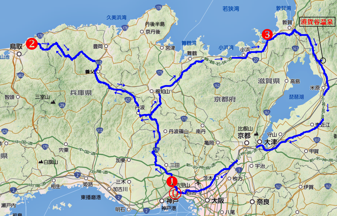 今回(4月中旬)は近場の秘湯めぐりを計画、余りにも近くのため今まで探求していなかった兵庫県 有馬温泉 に源泉掛け流しの温泉があるお宿を見付け、⓪の自宅を起点としてこのお宿を①泊目(有馬温泉 月光園 鴻朧館)、そしてその後車で2~3時間の源泉掛け流しの秘湯 鳥取県の岩井温泉 岩井屋を②泊目 (2回目の訪問)、③泊目福井県の虹岳島温泉 虹岳島荘、そして帰宅途中で 滋賀県の須賀谷温泉に立ち寄り下図の青いルートで巡りました。