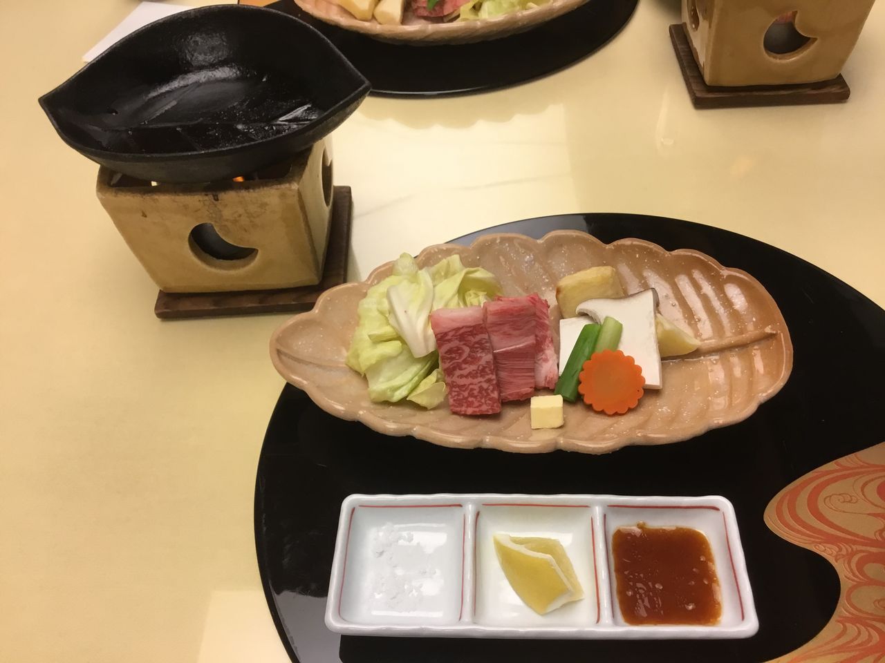 館内の温泉は全て循環濾過のため入浴をパスして金泉赤湯三昧となりました。食事の方ですが、夕朝食とも2階の割烹 弓張月で