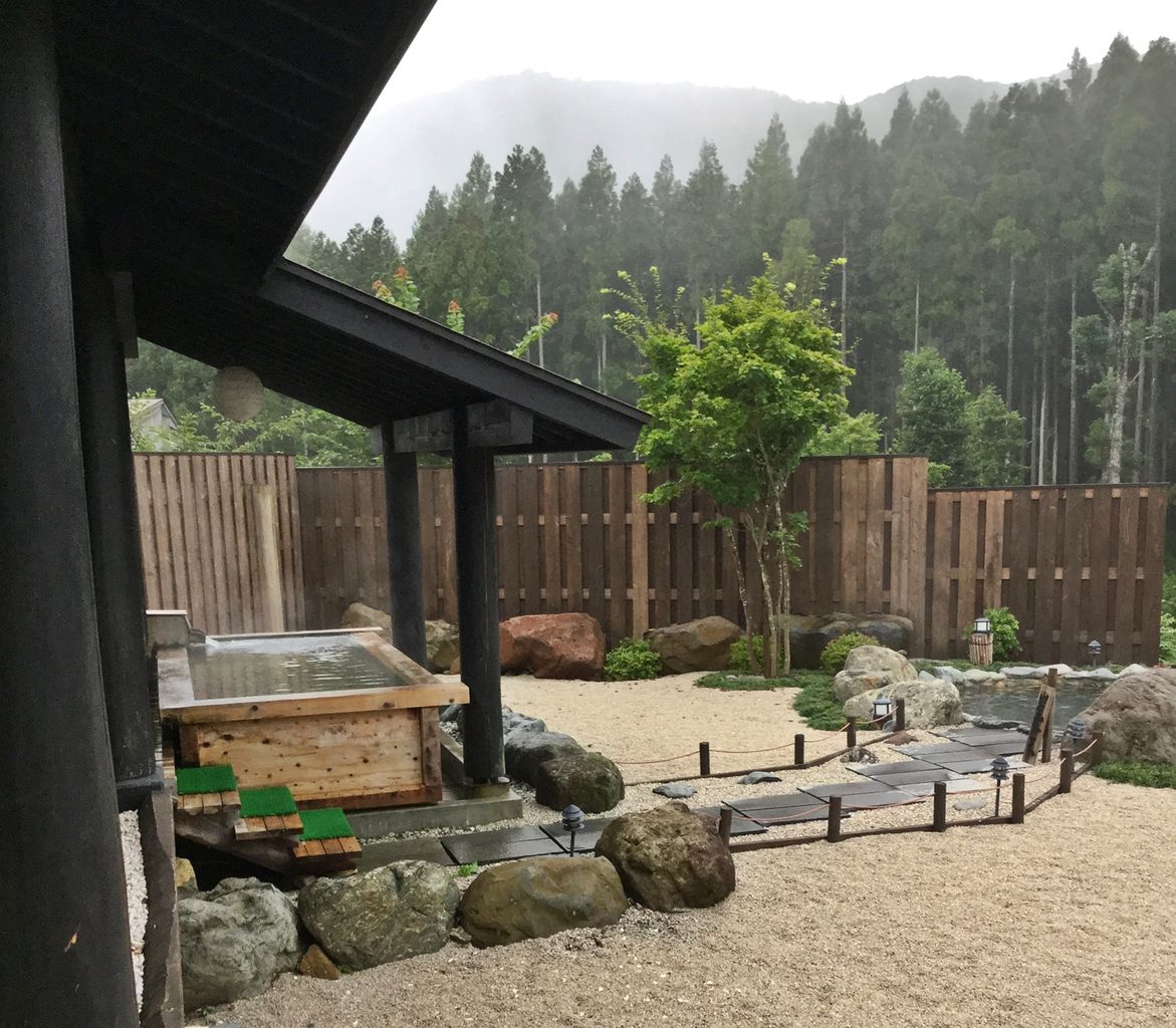 広くて快適です。しかも古民家の湯(みずばしょう温泉)が近くにあり、浴衣姿で中庭の端を歩いて通える便利な位置。早速、古民家の湯へ、入口に江戸時代の古民家2棟を移設し、再構成した専用浴場と説明されており、内湯といえど窓は開け放された半露天状態、本当に100%源泉かけ流し?かと思うぐらいたっぷりの湯。湯船の深さも十分で、源泉温度は48.2℃、Ph? 泉質はナトリウム-炭酸水素塩温泉(低調性中性高温泉)と表記。